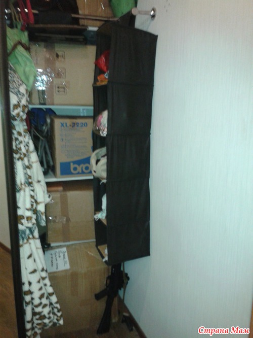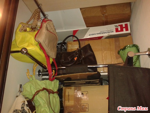 Наверху - объемнейшая антресоль, протяженностью почти на пол-коридора. И еще я придумала, а муж воплотил в жизнь, место для хранения моих сумок