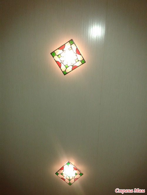 Ну, и потолок. Страдала я одно время по витражным светильникам. Не помню, как называется техника исполнения, но они делались из кусочков цветного стекла. Стоили бешеных денег. Увидели мы в магазине вот такие точечные светильники и, разумеется, я не устояла.