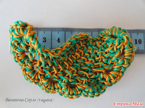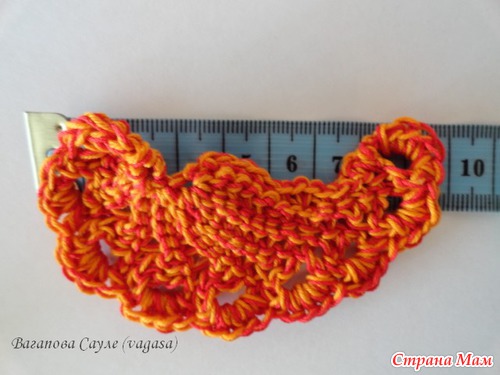 Этот листочек был связан крючком №2, сложением двух нитей, т. е. брала сразу две нитки разных цветов Коко. получился лист в длину 9 см, в ширину 4,5 см (в самой широкой части).