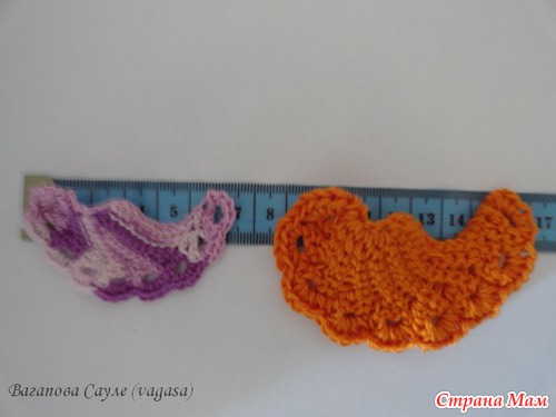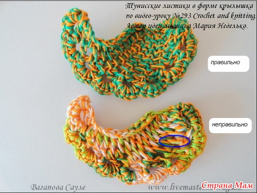 Мне эти тунисские листочки напомнили больше не крылышки, а ракушки. Поэтому я решила, что оставлю в качестве лицевой стороны ту, что показана на фото выше. А ниже другая сторона листа, которая на видео, как я поняла, является лицевой.