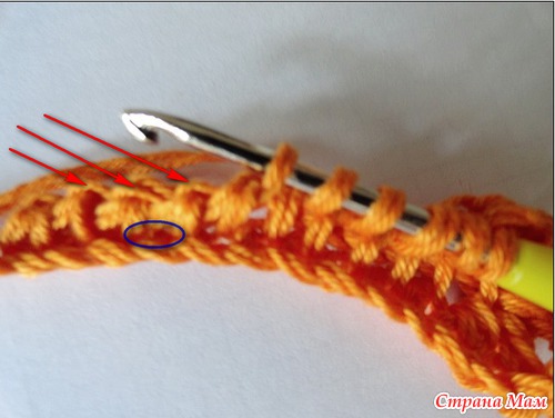 Почему так получилось? В видео-уроке говорится, что нужно вытягивать нить из горизонтальной петельки. В первый раз я не поняла, и вытягивала ее из арочки (на фото ниже в синем круге), а нужно крючок просовывать именно под ту самую горизонтальную петлю (показала красными стрелками).