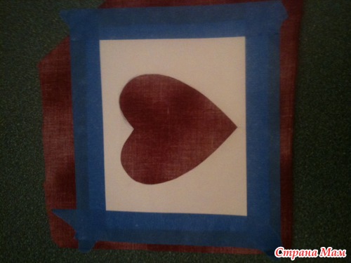 Фиксируем бумажный шаблон с помощью малярной ленты на обратной стороне фоновой ткани