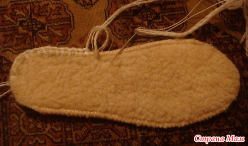 Желательно на нижнюю стельку взять более крепкие нитки или добавить тонкую прочную нитку, например, капроновую.