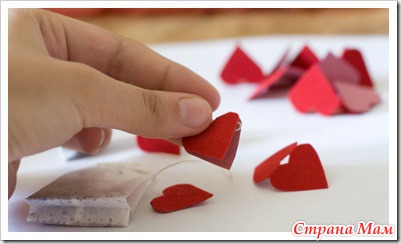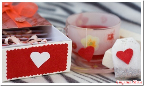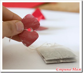 3. С чая снимаем ненужные нам бирки и этикетки и вместо них, с помощью клея ПВА, приклеиваем сердечки.