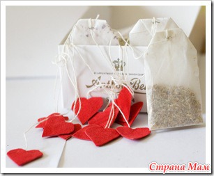 У нас получились чайные пакетики с сердечками на концах веревочек. Смотрится очень мило.