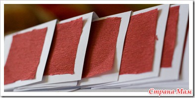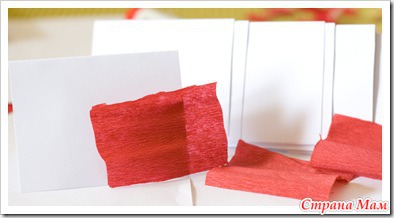 Из красной жатой бумаги вырезаем прямоугольники и приклеиваем на картон посередине.