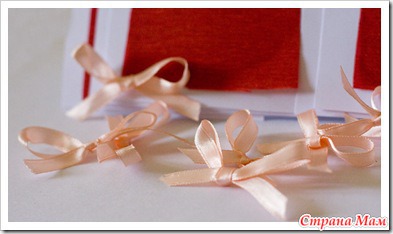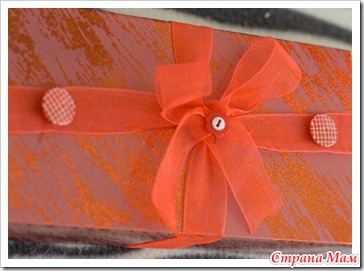 1. Для начала возьмем верхнюю часть коробочки и обклеим ее оберточной бумагой. Для этого нам понадобятся ножниц и клей-карандаш. Завяжем красную ленточку и пришьем на нее подходящие по цвету пуговицы.