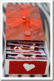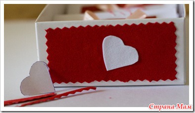 5. По бокам коробочку декорируем сердечком. Для этого из красной бархатной бумаги рифлеными ножницами вырезаем прямоугольник и клеим на него белое бархатное сердце.