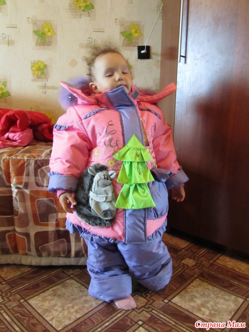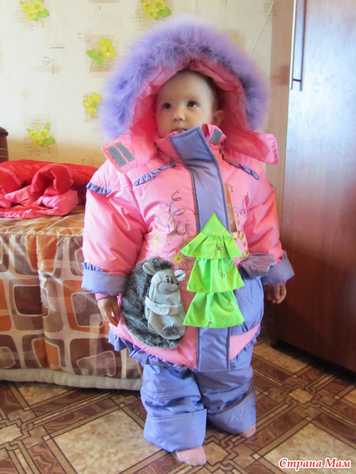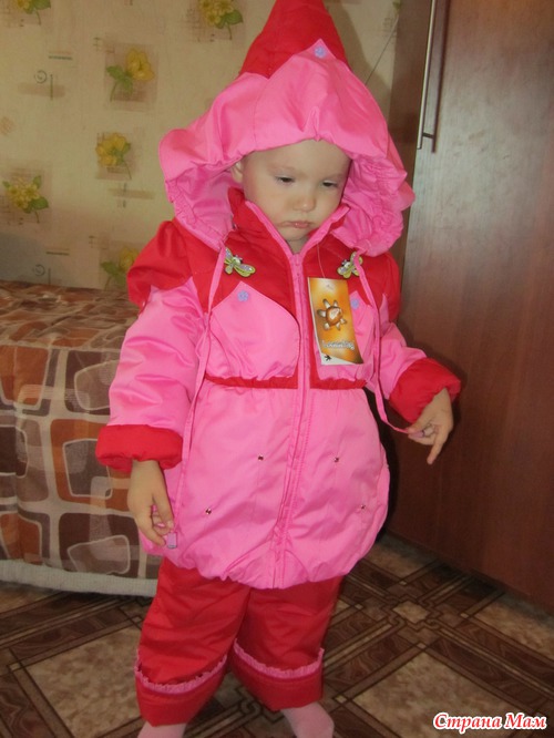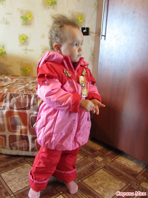 Сказать что вещи красивые - это ничего не сказать. пока дочка спала через каждые пять минут смотрела и любовалась куртками. Стрекоза нам почти как раз, но еще запас отворот есть. А Елка большевата, но ничего - нам до зимы расти да расти. На недовольную мордочку дочки не смотрите - она только проснулась. Ей тоже понравились курточки. Она у нас еще та воображуля. На волосы не смотрим - у мамы времени не было.