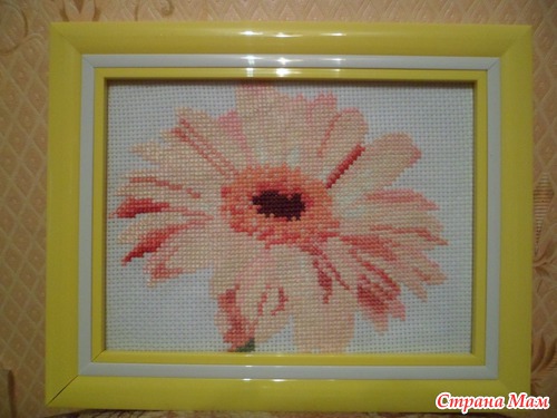 Девочки, как и обещала оформленные Герберы, первый цветок. Планы немного изменились и когда будет готова вся серия под вопросом. Поэтому решили пока повесить эту картину на кухне