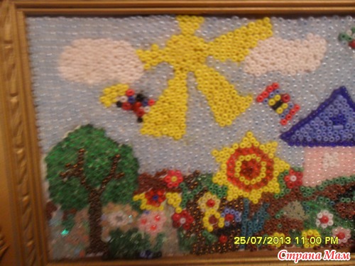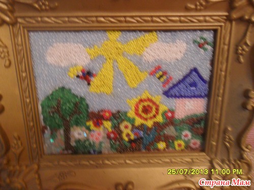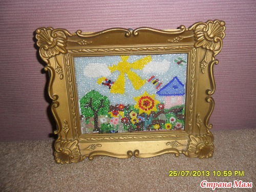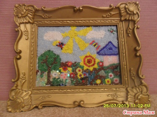 Давно уже мы с дочкой сделали картину из бисера. Вдохновились в магазине. Там продавали большие картины, выложенные бисером. Титанический труд. И мы попробовали. Картинка маленькая и то на нее ушло несколько дней. Клеили на ПВА.