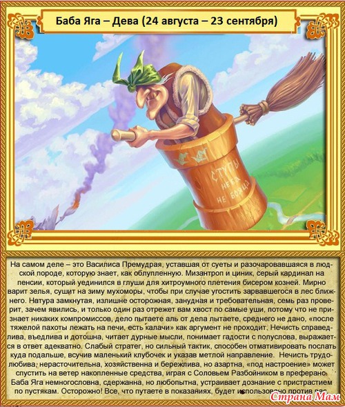 БАБА ЯГА – Дева (24 августа – 23 сентября)На самом деле – это Василиса Премудрая, уставшая от суеты и разочаровавшаяся в людской породе, которую знает, как облупленную. Мизантроп и циник, серый кардинал на пенсии, который уединился в глуши для хитроумного плетения бисером козней. Мирно варит зелья, сушит на зиму мухоморы, чтобы при случае угостить зарвавшегося в лес ближнего. Натура замкнутая, излишне осторожная, занудная и требовательная, семь раз проверит, зачем явились, и только один раз отрежет вам хвост по самые уши, потому что не признаёт никаких компромиссов, дело пытаете аль от дела лытаете, среднего не дано, «после тяжёлой пахоты лежать на печи, есть калачи» как аргумент не проходит. Нечисть справедлива, въедлива и дотошна, читает дурные мысли, понимает гадости с полуслова, выражается в ответ адекватно. Слабый стратег, но сильный тактик, способен отмативировать послать куда подальше, всучив маленький клубочек и указав метлой направление. Замечания Бабы Яги часто ранят, поступки шокируют, безжалостность и холодность обижают добрых молодцев, но её помощь эффективна как «мёртвая» + «живая» вода, когда вас уже порубили в капусту. Нечисть трудолюбива, нерасточительна, хозяйственна и бережлива, но азартна, «под настроение» может спустить на ветер накопленные средства, играя с Соловьём Разбойником в преферанс. У Яги в избушке идеальная организация труда, зелья расставлены в правильном беспорядке, пауки ткут паутину в строго отведённых углах, кот гадит исключительно, где придётся, мыши строятся и бегают в чёткой последовательности свиньями, мухи летают по намеченной траектории. Баба Яга немногословна, сдержанна, но любопытна, устраивает дознание с пристрастием по пустякам. Осторожно! Всё, что путаете в показаниях, будет использовано против вас.