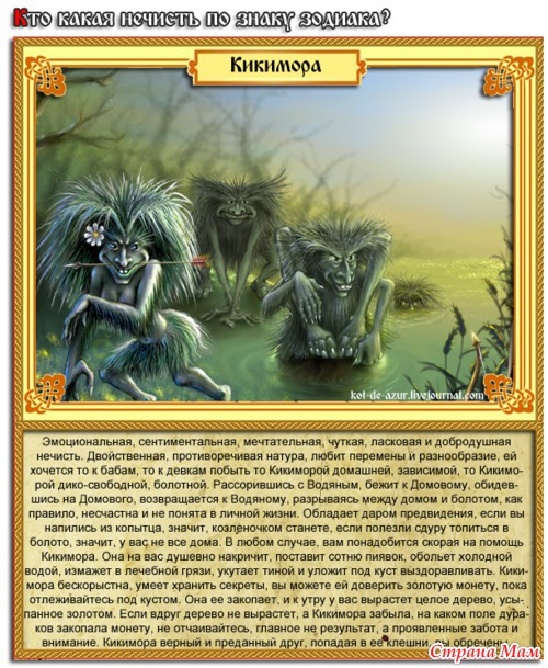 КИКИМОРА – Рак (22 июня – 22 июля) Эмоциональная, сентиментальная, мечтательная, чуткая, ласковая и добродушная нечисть. Двойственная, противоречивая натура, любит перемены и разнообразие, ей хочется то к бабам, то к девкам побыть то Кикиморой домашней, зависимой, то Кикиморой дико-свободной, болотной. Рассорившись с Водяным, бежит к Домовому, обидевшись на Домового, возвращается к Водяному, разрываясь между домом и болотом, как правило, несчастна и не понята в личной жизни. Обладает даром предвидения, если вы напились из копытца, значит, козлёночком станете, если полезли сдуру топиться в болото, значит, у вас не все дома. В любом случае, вам понадобится скорая на помощь Кикимора. Она на вас душевно накричит, поставит сотню пиявок, обольёт холодной водой, измажет в лечебной грязи, укутает тиной и уложит под куст выздоравливать. Кикимора бескорыстна, умеет хранить секреты, вы можете ей доверить золотую монету, пока отлёживайтесь под кустом. Она её закопает, и к утру у вас вырастет целое дерево, усыпанное золотом. Если вдруг дерево не вырастет, а Кикимора забыла, на каком поле дураков закопала монету, не отчаивайтесь, главное не результат, а проявленные забота и внимание. Кикимора верный и преданный друг, попадая в её клешни, вы обречены. Теперь за вас и ваших детей до седьмого колена будут думать одно, говорить другое и делать третье. Скучно не будет, мало не покажется, потому что Кикимора обладает неукротимой энергией и богатой фантазией.