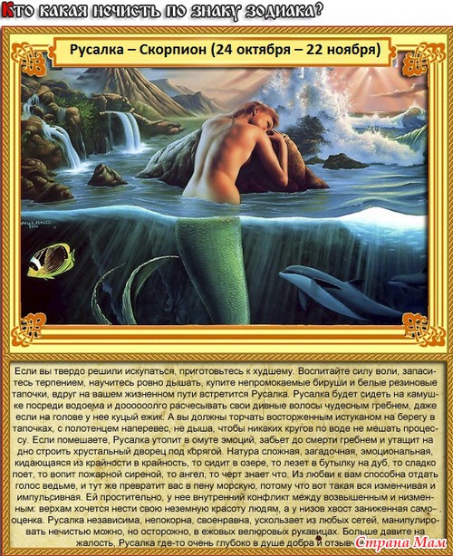 РУСАЛКА – Скорпион (24 октября – 22 ноября). Если вы твёрдо решили искупаться, приготовьтесь к худшему. Воспитайте силу воли, запаситесь терпением, научитесь ровно дышать, купите непромокаемые бируши и белые резиновые тапочки, вдруг на вашем жизненном пути встретится Русалка. Потренируйтесь сначала плавать на суше, потому что русалки встречаются даже по дороге в ванную, тогда на ближайшее время водные процедуры отменяются. «Пуп Земли» моется в первую очередь и столько, сколько считает нужным. Нечисть точно знает, чего хочет ОНА и ей абсолютно начихать на то, чего хотите ВЫ. Русалка будет сидеть на камушке посреди водоёма и доооооолго расчёсывать свои дивные волосы чудесным гребнем, даже если на голове у неё куцый ёжик. А вы должны торчать восторженным истуканом на берегу в тапочках, с полотенцем наперевес, не дыша, чтобы никаких кругов по воде не мешать процессу. Если помешаете, Русалка утопит в омуте эмоций, забьёт до смерти гребнем и утащит на дно строить хрустальный дворец под корягой. Натура сложная, загадочная, эмоциональная, кидающаяся из крайности в крайность, то сидит в озере, то лезет в бутылку на дуб, то сладко поёт, то вопит пожарной сиреной, то ангел, то чёрт знает что. Из любви к вам способна отдать голос ведьме, и тут же превратит вас в пену морскую, потому что вот такая вся изменчивая и импульсивная. Ей простительно, у неё внутренний конфликт между возвышенным и низменным: верхам хочется нести свою неземную красоту людям, а у низов хвост заниженная самооценка. Русалка независима, непокорна, своенравна, ускользает из любых сетей, манипулировать нечистью можно, но осторожно, в ежовых велюровых рукавицах. Больше давите на жалость, Русалка где-то очень глубоко в душе добра и отзывчива.