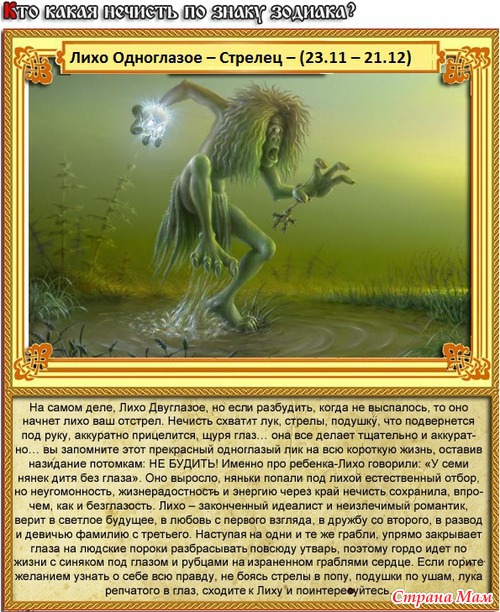 ЛИХО ОДНОГЛАЗОЕ – Стрелец – (23 ноября – 21 декабря). На самом деле, Лихо Двуглазое, но если разбудить, когда не выспалось, то оно начнёт лихо ваш отстрел. Нечисть схватит лук, стрелы, подушку, что подвернётся под руку, аккуратно прицелится, щуря глаз… она всё делает тщательно и аккуратно… вы запомните этот прекрасный одноглазый лик на всю короткую жизнь, оставив назидание потомкам: НЕ БУДИТЬ! Именно про ребёнка-Лихо говорили: «У семи нянек дитя без глаза». Оно выросло, няньки попали под лихой естественный отбор, но неугомонность, жизнерадостность и энергию через край нечисть сохранила, впрочем, как и безглазость. Лихо – законченный идеалист и неизлечимый романтик, верит в светлое будущее, в любовь с первого взгляда, в дружбу со второго, в развод и девичью фамилию с третьего. Наступая на одни и те же грабли, упрямо закрывает глаза на людские пороки разбрасывать повсюду утварь, поэтому гордо идёт по жизни с синяком под глазом и рубцами на израненном граблями сердце. Если горите желанием узнать о себе всю правду, не боясь стрелы в попу, подушки по ушам, лука репчатого в глаз, сходите к Лиху и поинтересуйтесь. Проницательное, наблюдательное, откровенное оно выразит личное мнение с прямотой, тактом и неотвратимостью летящего на вас бронепоезда без тормозов. Нечисть интенсивно и страстно жаждет приключений на свою ж ярких впечатлений и новых ощущений, поэтому её несёт и заносит… туда, где опасно, любопытно и вкусно пахнет.