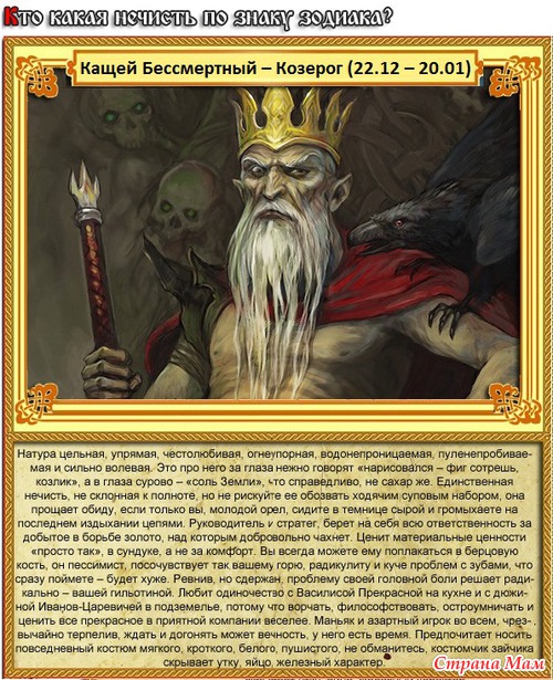 КАЩЕЙ БЕССМЕРТНЫЙ – Козерог (22 декабря – 20 января). Натура цельная, упрямая, честолюбивая, огнеупорная, водонепроницаемая, пуленепробиваемая и сильно волевая. Это про него за глаза нежно говорят «нарисовался – фиг сотрёшь, козлик», а в глаза сурово – «соль Земли», что справедливо, не сахар же. Единственная нечисть, не склонная к полноте, но не рискуйте её обозвать ходячим суповым набором, она прощает обиду, если только вы, молодой орёл, сидите в темнице сырой и громыхаете на последнем издыхании цепями. Руководитель и стратег, берёт на себя всю ответственность за добытое в борьбе золото, над которым добровольно чахнет. Ценит материальные ценности «просто так», в сундуке, а не за комфорт. Вы всегда можете ему поплакаться в берцовую кость, он пессимист, посочувствует так вашему горю, радикулиту и куче проблем с зубами, что сразу поймёте – будет хуже. Ревнив, но сдержан, проблему своей головной боли решает радикально – вашей гильотиной. Любит одиночество с Василисой Прекрасной на кухне и с дюжиной Иванов-Царевичей в подземелье, потому что ворчать, философствовать, остроумничать и ценить всё прекрасное в приятной компании веселее. Маньяк и азартный игрок во всём, чрезвычайно терпелив, ждать и догонять может вечность, у него есть время. Предпочитает носить повседневный костюм мягкого, кроткого, белого, пушистого, не обманитесь, костюмчик зайчика скрывает утку, яйцо, железный характер.