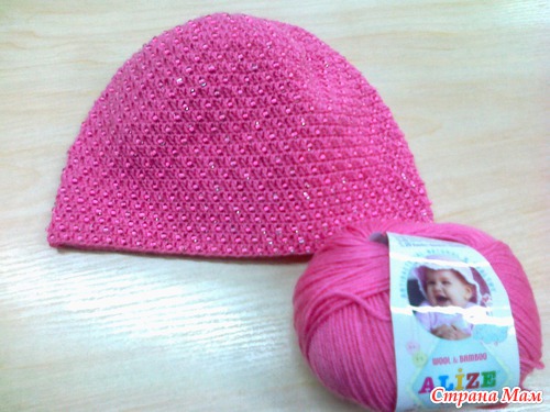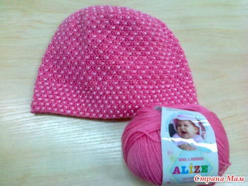 Описание: Нанизываем на нитку бисер приблизительно 300 шт, можно меньше, легче потом будет передвигать, но чаще отрывать придется и нанизывать бисер снова(на изделие уходит 90 грамм, но всегда взвешиваю 100г, т. к. в китайском бисере приблизительно 10г брака). На одну шапочку уходит 50 г ниток (Размер шапочки 52-54), крючок использую № 2,75 Кловер.