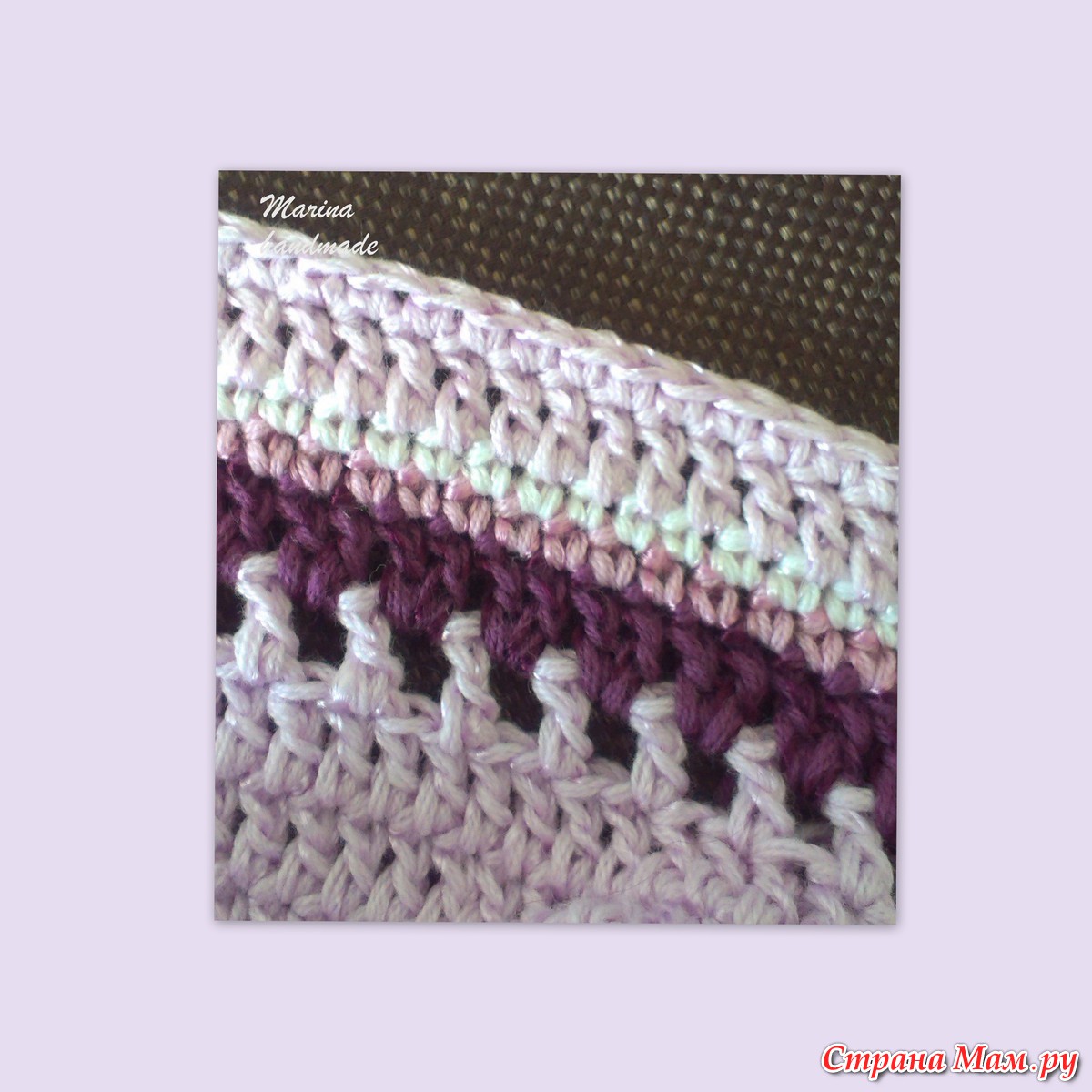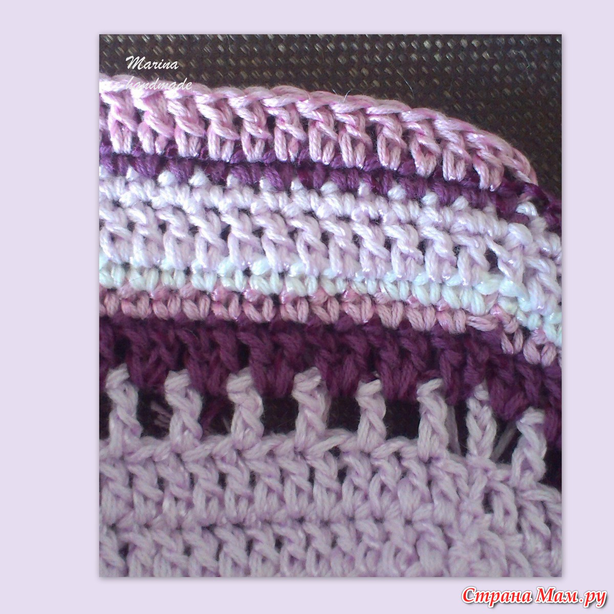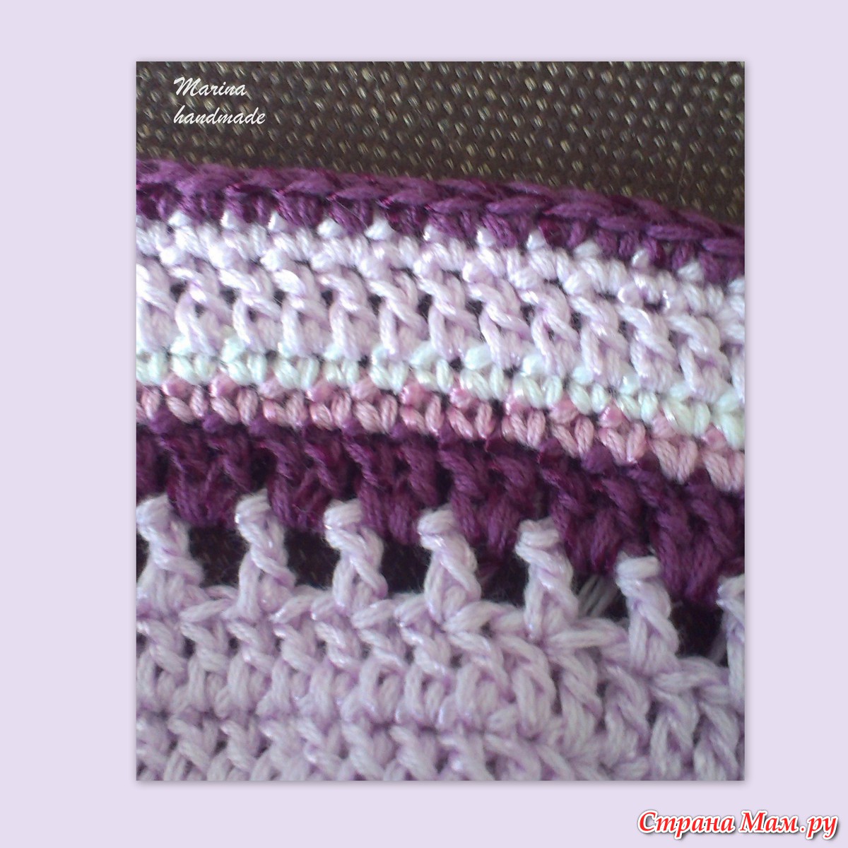 18, 19 ряды вяжем СБН, добавляя ещё два цвета. У меня пошёл сиреневый, за ним белый.
