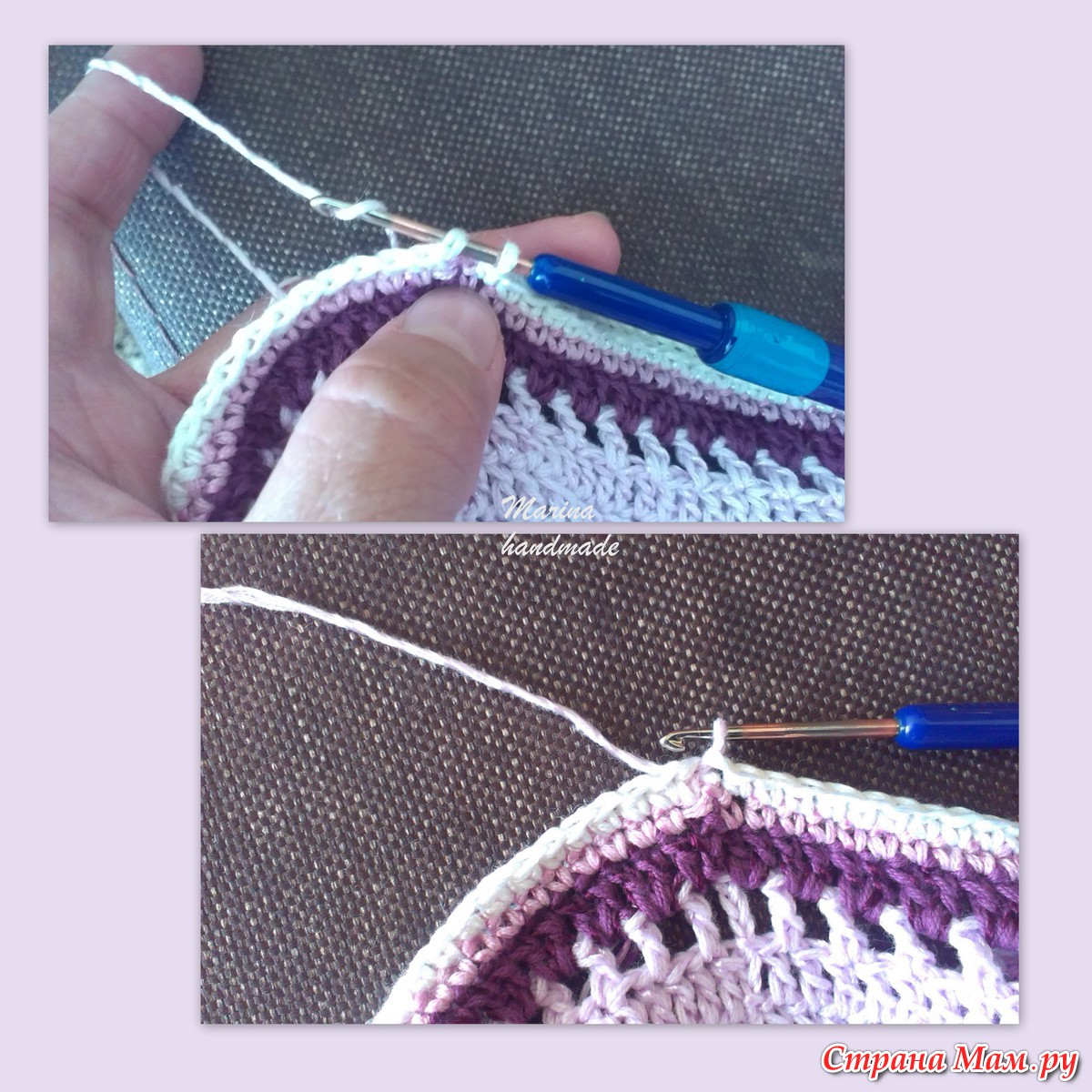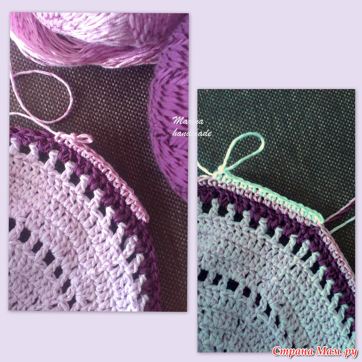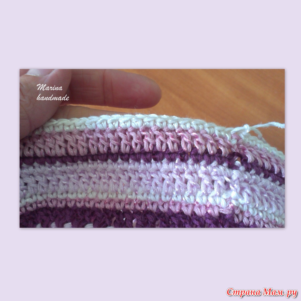 18, 19 ряды вяжем СБН, добавляя ещё два цвета. У меня пошёл сиреневый, за ним белый.