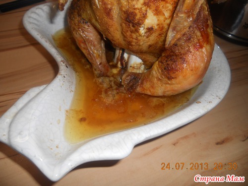 обсыпаю солью и специями и на кол! Да, маленький нюанс - на дно формы наливаю немного воды, чтобы вытекающий из тушки жир не пригорал к форме.