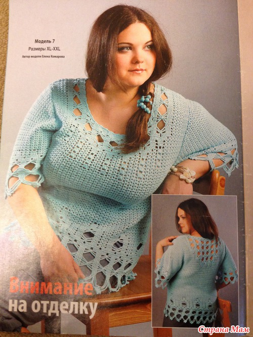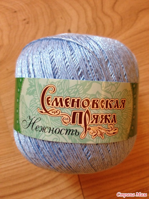 В журнале приглянулась мне моделька, решила её связать. Нитки Семеновская Нежность 400м 100гр, 47% хлопка, 53% вискоза, крючок 1.5, ушло 4.5 моточка. Вязала по кругу.