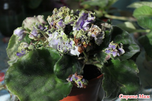 С этой фиалкой воюю уже несколько лет, очень капризная, чуть что не по ней - сразу начинают подсыхать краешки цветков, хотя цветет обильно, цветоносы скрученные, поэтому мне она не очень нравится