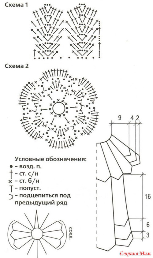 Сборка: обвяжите вырез горловины столбиками б/н, выполняя петлю для пуговицы. Пришейте пуговицу. Свяжите 3 цветочка по схеме 2. Затем отдельно для каждого цветка свяжите серединку: наберите б возд. п., замкните в кольцо соед. столбиком. Наберите 3 возд. п. подъема и ввяжите 17 ст. с/н в центр кольца. Замкните ряд соед. столбиком. Пришейте серединку к цветам, цветы - к платью.
