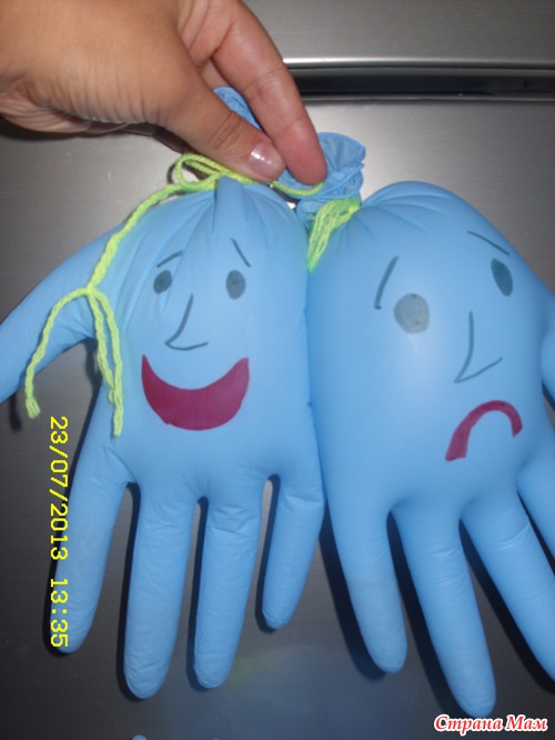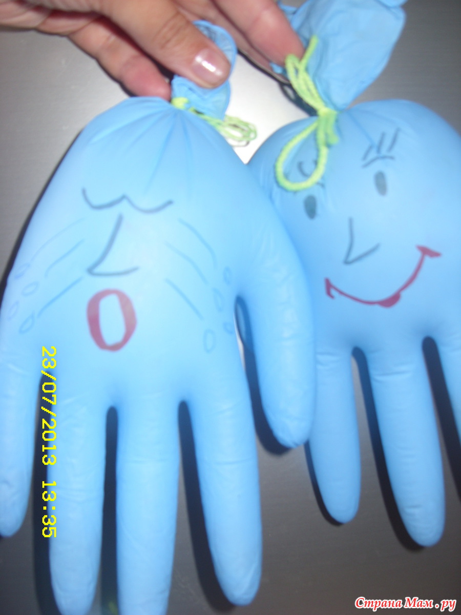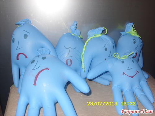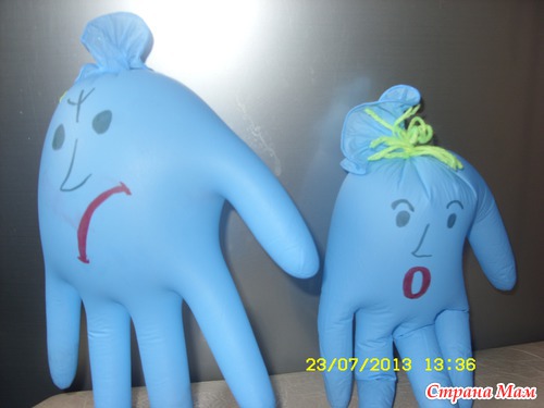 Для этого взяла медицинские перчатки, они были в роли человечков, в пальчики для тяжести насыпала гречку, надула, разрисовала фломастерами рожицы. Вот собственно и все!!! Бери и играй!!!