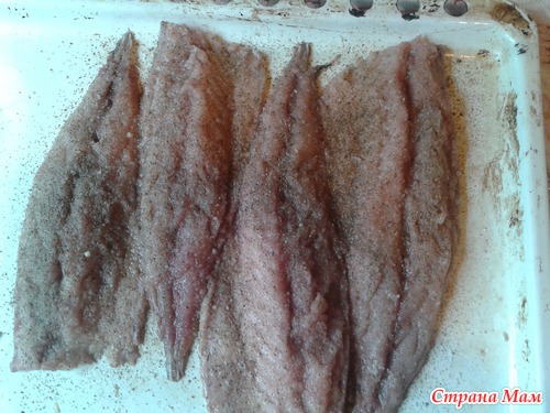 Потрошим, отрезаем головы, извлекаем хребет и получаем 4 филе. Шкуру не снимаем.