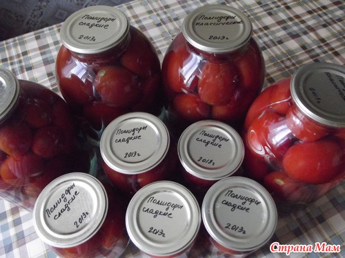 Боремся с урожаем. По другому не назовёшь. Шесть дней перерабатывали только одни помидоры. Делюсь проверенными рецептами, как я консервирую помидоры на зиму. Целыми помидоры я закатываю двумя способами. 1) Рецепт 1. "Помидоры сладкие". Пусть это название (сладкие) вас не смущает. На самом деле помидоры и рассол очень-очень вкусные. Сахар в этом маринаде придаёт привкус пикантности. Рецепт рассчитан на 3-х литровую банку. В банку положить 1 зубик чеснока, 1 лавровый лист, 1 стручок горького перца, 10 горошин душистого чёрного перца. Первый раз залить кипятком. Накрыть крышкой и дать постоять 20 минут. Слить в кастрюлю, добавить 2 ст. л. (с небольшой горкой) соли и 5 ст. л. сахара. Закипятить, добавить 1 ч. л. уксусной эссенции и залить помидоры. Закатать, перевернуть, укутать.