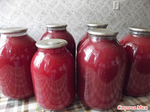 3) Томатный сок, томатная паста. Помидоры пропустить через соковыжималку. Если будем делать сок, то на ведро сока - 150 гр соли. Кипятить 15 минут, залить в банки, закатать, перевернуть, укутать. Если делать томатную пасту, то соли на ведро сока - около 100 гр. и уваривать до уменьшения объёма в половину.