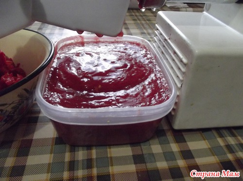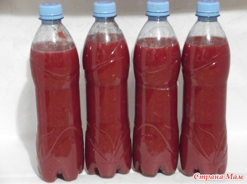 Решила в этом году заморозить свежий сок помидор. Сделала это впервые. Помидоры пропущены через соковыжималку, посолены. Свежий сок залила в пластиковые бутылки и в морозилку. Это эксперимент.