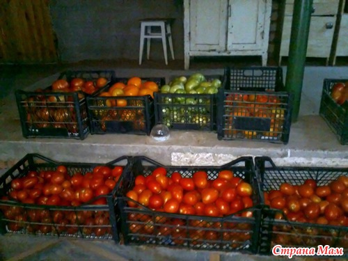 Основная масса помидор у нас шла на переработку сорт "Рио-Гранде". Нижний ряд ящиков. Помидоры весом 120-150 гр, крепкие, мясистые. Очень хороши для томата и для консервирования целыми.