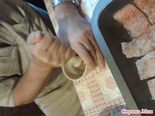 Растираем кориандр и посыпаем рыбку.