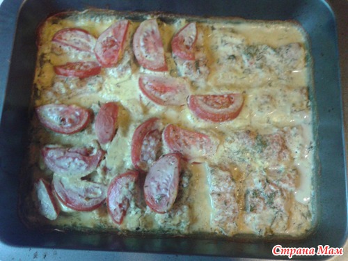 Нарезанный дольками помидор выкладываем сверху на рыбу. Так как ребенок принципиально не ест помидоры, часть рыбы запекаем без помидор.