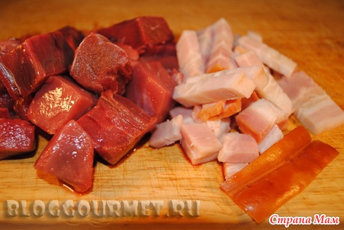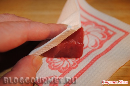 1,5кг говяжьей мякоти, нарезаем кубиками со стороной около 2,5см. Обсушиваем говядину бумажными полотенцами, потому что влажное мясо не зажарится.