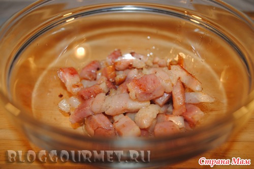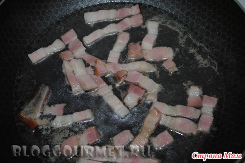 Срезаем шкурку и нарезаем бекон кусочками ок.6-7мм толщиной и ок. 4см длиной.