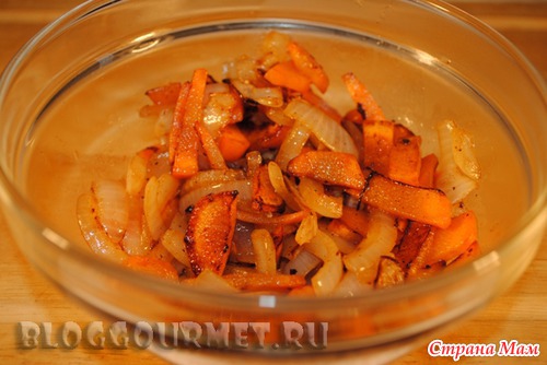 1 нарезанная ломтиками морковь, 1 нарезанная полукольцами луковица.