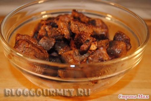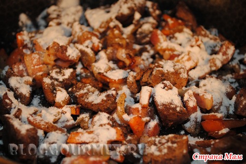 Ставим сковороду в центральную часть нагретой духовки на 4 минуты. Перемешиваем мясо и снова возвращаем в духовку еще на 4 минуты. (Благодаря этому мука поджаривается и покрывает мясо тонкой корочкой). Вынимаем сковороду и убавляем духовку до 160гр.