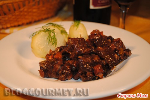 (Говядина, тушеная в красном вине с беконом, луком и грибами)