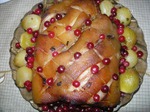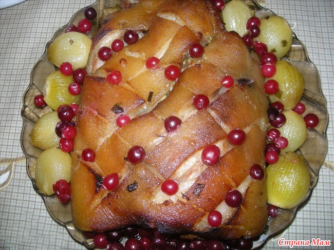 Порядок приготовления: Рульку хорошо почистить, и замочить в воде на ночь. Воду слить, залить новой и поставить варить. Рульку варим до готовности, (часа четыре) со всякими специями - луковица, морковка, лавровый лист, гвоздика, перец горошком, соль. Когда рулька остынет, вытаскиваем из бульона (кстати, из бульона получается отличный супчик ) берем фольгу - выкладываем на нее рульку, разрезаем, вытаскиваем кость. Смазываем горчицей, посыпаем измельченным чесночком. Зеленый лук мелко нарезаем, смешиваем с клюквой. Вкладываем начинку из лука вместо кости, сворачиваем и связываем ниткой. Потом обсыпаем рульку сверху и с боков специями, делаем несколько надрезов на коже, раскладываем несколько маленьких луковичек. Заворачиваем в фольгу, кладем на противень и ставим в разогретую духовку примерно на 30 минут. Развернуть фольгу и оставить запекать еще минут 10, чтоб кожица подрумянилась. Выкладываем на блюдо и украшаем клюквой. Подавать горячим.