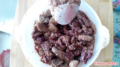 я брала вишни без косточек, с варенья, только сами вишенки на глаз примерно 3-4 ст. л., плитку шоколада с холодильника перемолола в кофемолке ( если будут комочки, кусочки шоколада, ничего страшного, даже вкуснее). Перемешиваем вишню и шоколад, если делаете для взрослых, можно несколько капель рома или коньяка, я делала для дочи, поэтому без алкоголя) начинка готова, если у вас получилась жидковатая, можно крахмала немного, я не добавляла. Дальше включают духовку на 180 гр., и готовлю формы для кексов, на дно формы немного теста