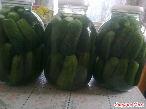 В промытые банки стоя,"попочками" вниз укладываю огурчики. Заливаю горячей(не кипятком)водой и даю постоять минут 10...