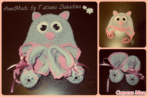 Комплект "Кошечка" - шапочка и пинетки. Стоимость подобного комплекта 700 рублей. Хлопок+акрил.