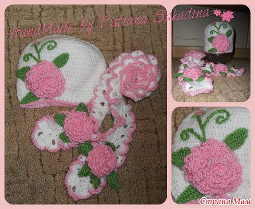 Комплект "Романтичная особа" - шапочка и шарф с розами. Стоимость подобного комплекта - 800 рублей. Шерсть+акрил.
