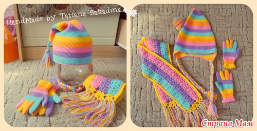 Комплект "Радуга" - шапочка, шарф и перчатки. Стоимость подобного комплекта - 1500 рублей. Шерсть+акрил.