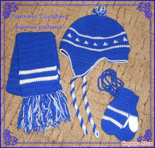 Комплект для мальчика - шапка, шарф, варежки. Стоимость подобного комплекта - 1500 рублей. Шерсть+акрил.