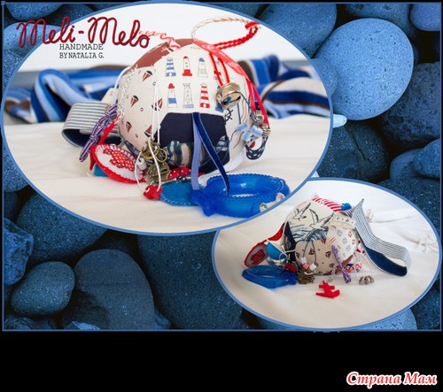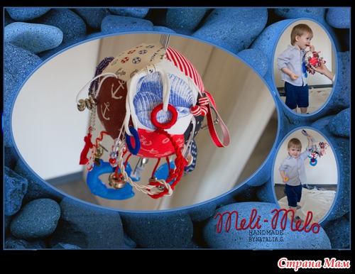 Подруга моей сестры тоже захотела такой мячик для своего сыночка, поэтому для маленького мальчика Феликса, который родился и живёт во Франции, сшила вот такую игрушку. С мамой Феликса мы решили сделать её в морском стиле.