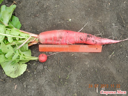 Купила семена редиса сорта Красный Великан. Вырос быстро и вот до таких размеров. (Линейка 25 см) А так он выпячивается из грядки Вкус как у обычных сортов, сочный, отличается только размерами. Читать полностью