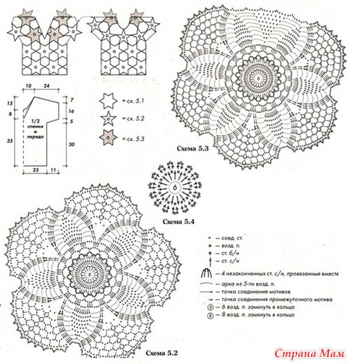 Для выполнения верхней части блузы связать 4 сокращенных мотива по схеме 5.3, прилегающие урезанным лепестком к вырезу горловины переда и спинки; 7 мотивов по схеме 5.2 с пятью лепестками. На схеме развертки показано соединение мотивов между собой по лепестком. Для заполнения промежутков между мотивами внутри полотна вязать мотив по схеме 5.4 и в последнем круговом ряду присоединять его к свободным кроям основных мотивов с помощью зацепа.